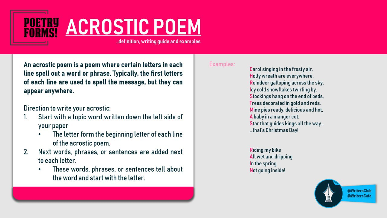 Although, acrostic as a poetic genre may be somewhat scorned, this clever form of wordplay has been used by such well-regarded authors as William Blake, Lewis Carroll, and John Milton.