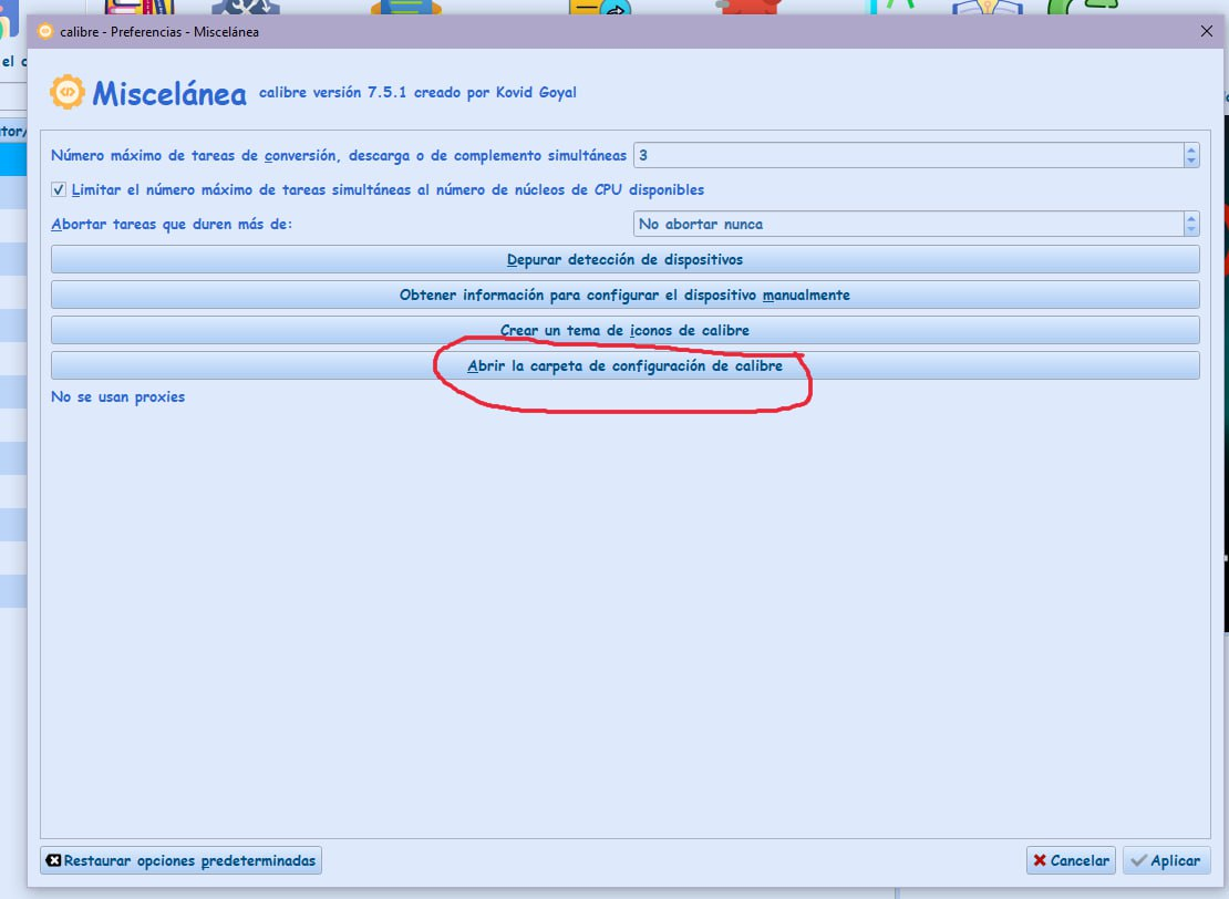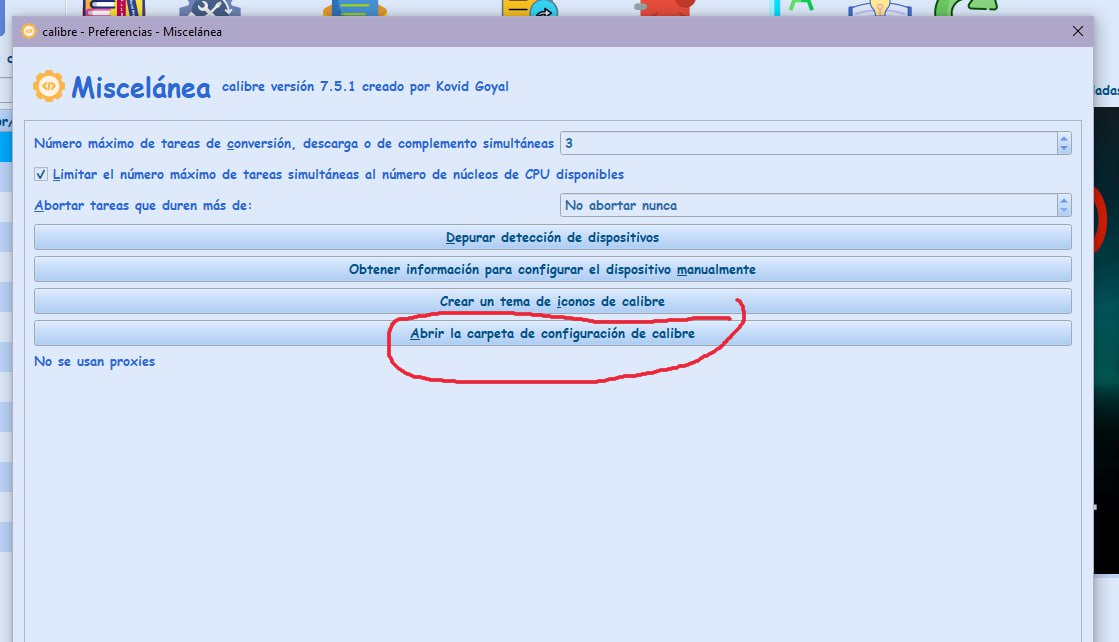 Preferencias —>Miscelanea—>Abrir carpeta de configuración de calibre