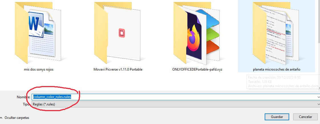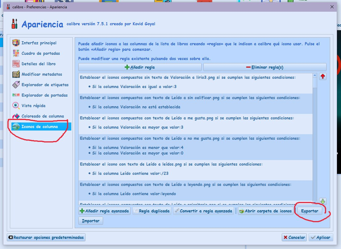 04) Preferencias—>Apariencia—>Situada en coloreado de columna, clicar en exportar.