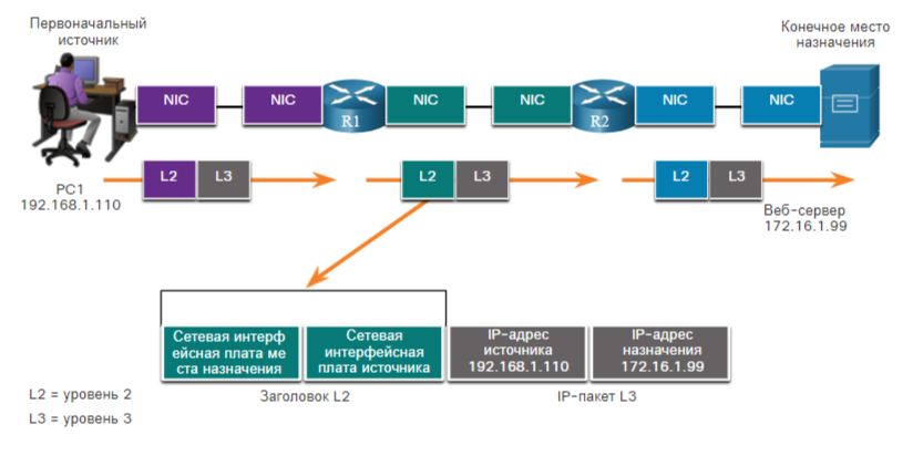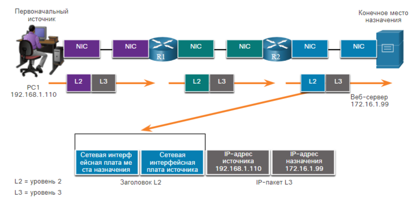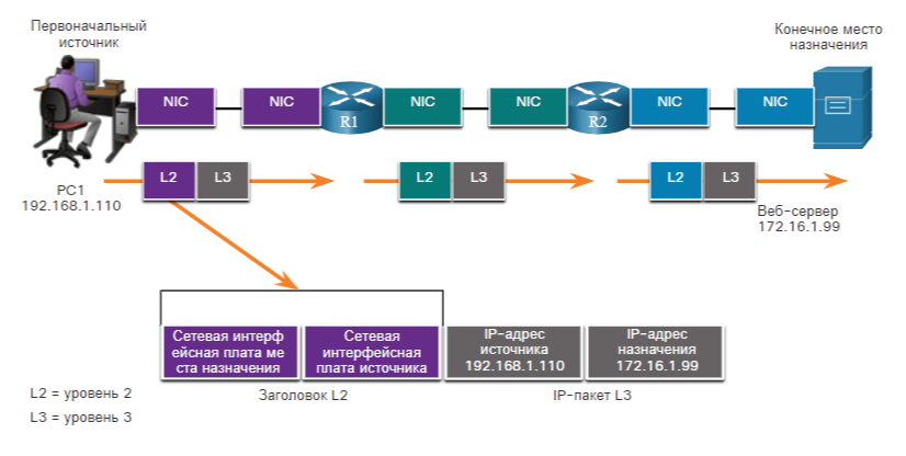 R1 инкапсулирует IP-пакет уровня 3 в новый кадр уровня 2. В заголовке кадра R1 добавляет свой адрес уровня 2 в качестве источника и адрес уровня 2 для R2 в качестве назначения.