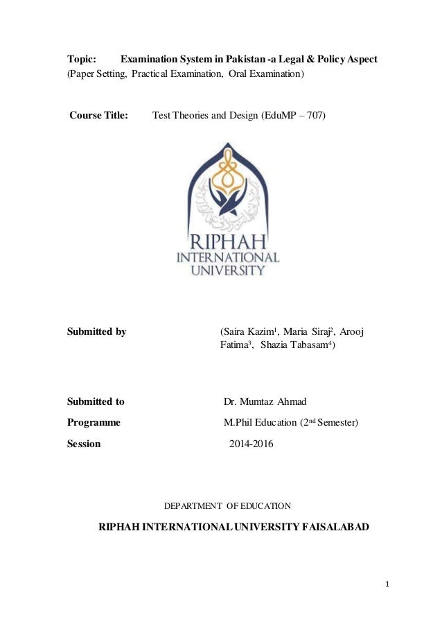 Examination System in Pakistan 1 . 1 Topic: Examination System in Pakistan -a Legal& Policy Aspect (Paper Setting, Practical Examination , Oral Examination ) Course Title: Test Theories and Design (EduMP - 707) Submitted by (Saira Kazim1, Maria Siraj2, Arooj Fatima3, Shazia Tabasam4) Submitted to Dr . Mumtaz Ahmad Programme M .Phil Education (2nd Semester) Session 2014-2016 DEPARTMENT OF . . .