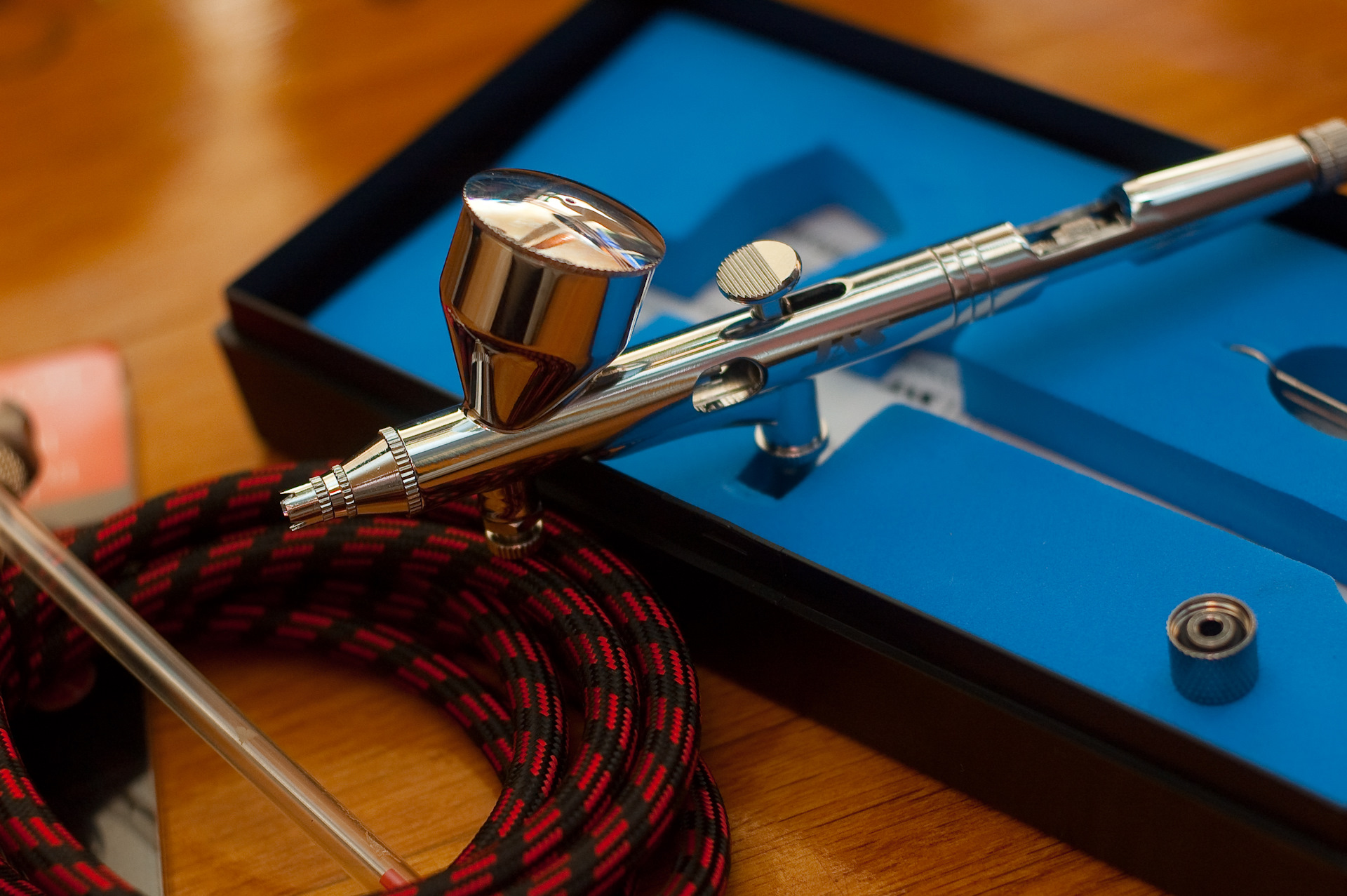 Внутри упаковки пластиковая коробка в которой удобно хранить аэрограф. Вверху справа ключ для замены сопла, а справа внизу штуцер для воздушного шланга, хотя все покупные шланги оснащены гайкой с резьбой для подсоединения к воздушному клапану и компрессору.