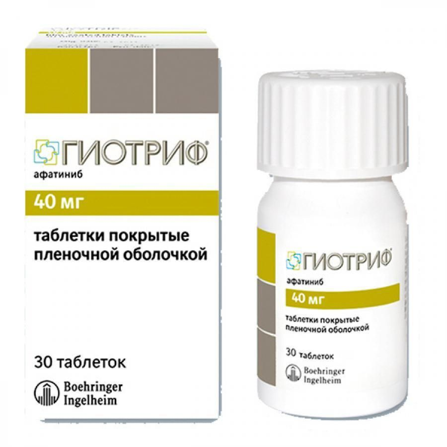 Афатиниб (Гиотриф) - селективный и необратимый ингибитор протеинкиназы рецепторов второго поколения семейства ERBB (HER), мишенью которого является цитоплазматический домен всех HER-рецепторов (EGFR (ERBB), HER2 (ERBB2), ERBBЗ и ERBB4). Блокируя их фосфорилирование, афатиниб препятствует инициации клеточной пролиферации, адгезии и инвазии, а также активации антиапоптотических механизмов.