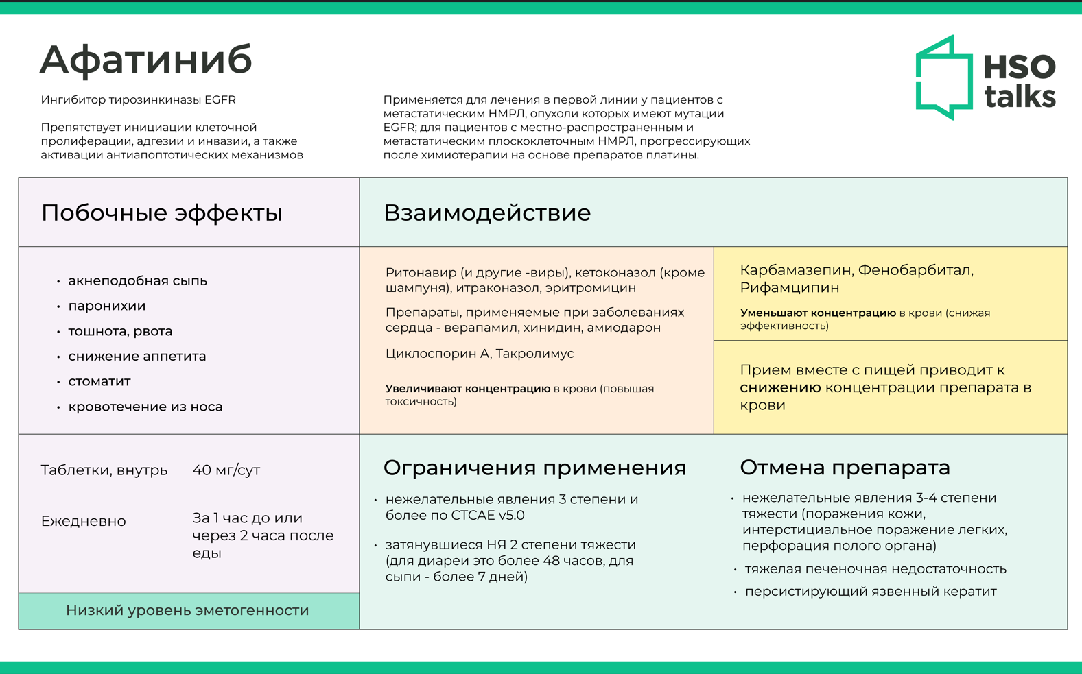 Такролимус, кстати, является дерматотропным средством, антагонистом кальциневрина, который рекомендован RUSSCO в качестве сопроводительной терапии при сыпи всех степеней, выраженном отеке и зуде, возникающих на фоне анти-EGFR терапии. Несмотря на то, что системная абсорбция такролимуса при использовании в форме мази минимальна, взаимодействие с афатинибом не может быть полностью исключено у пациентов с обширными участками поражения и/или эритродермией.