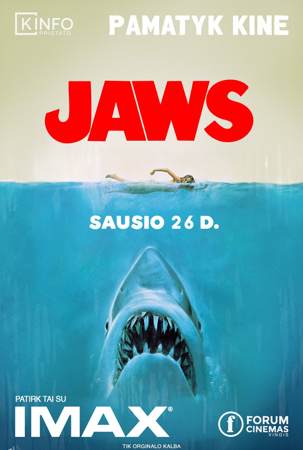 26 января в Вильнюсе, в кинотеатре Vingis, покажут «Челюсти» (1975) в обновлённом формате IMAX. По сюжету гигантская белая акула терроризирует остров Амити, и остановить её берутся начальник полиции, учёный и опытный рыбак.