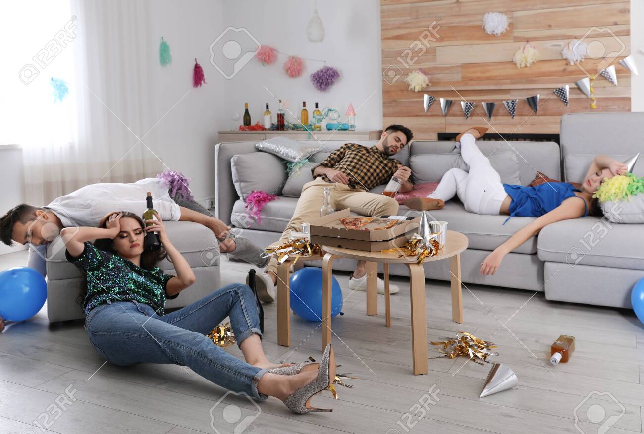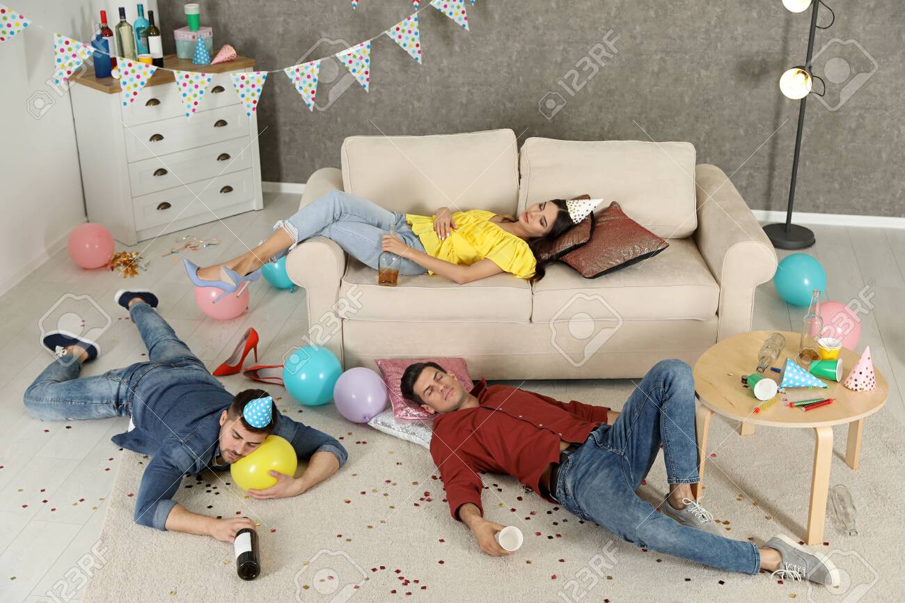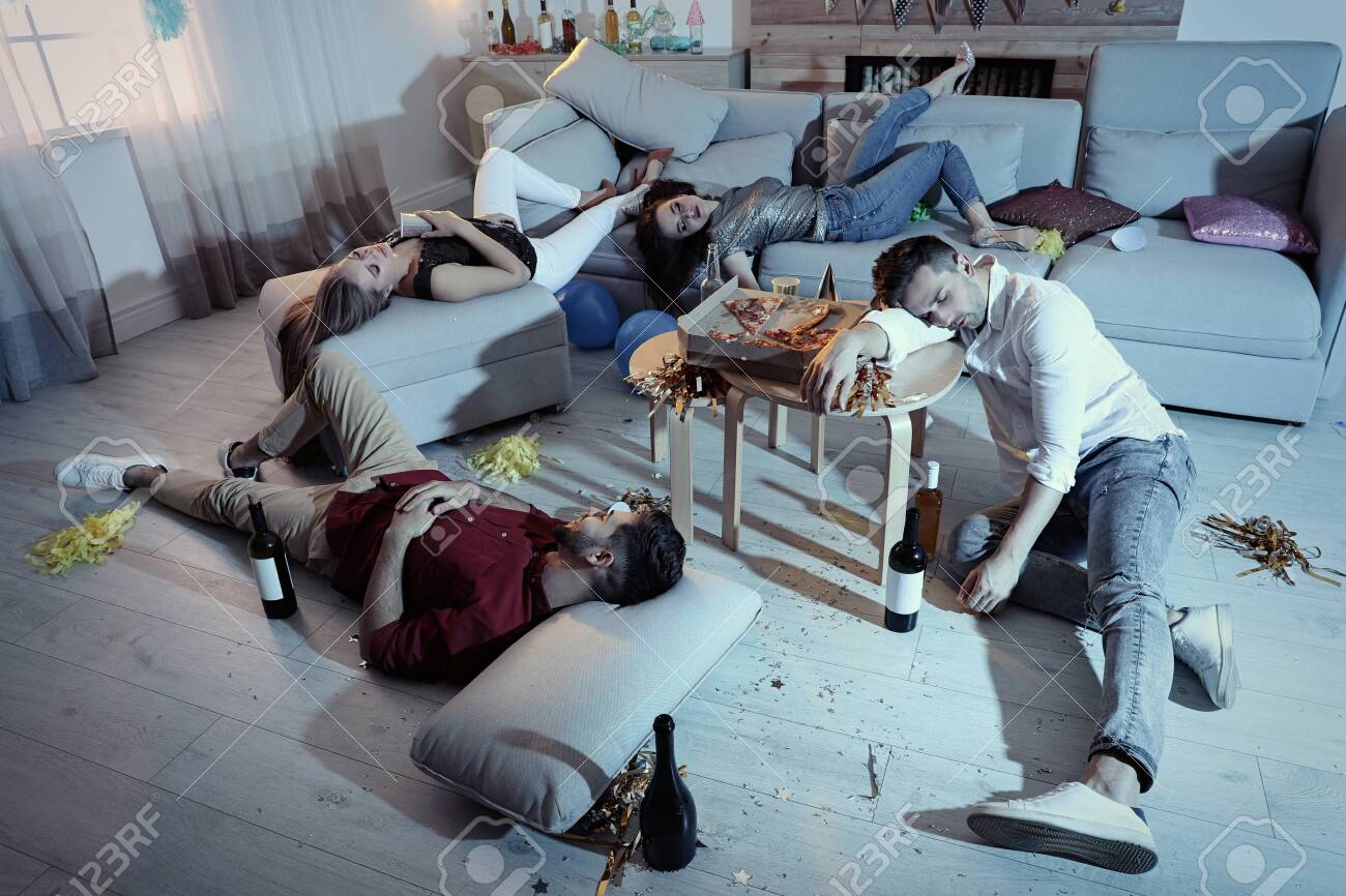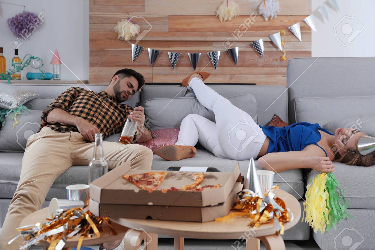 Drunk Friends Sleeping On Sofa In Messy Room After Party . . .