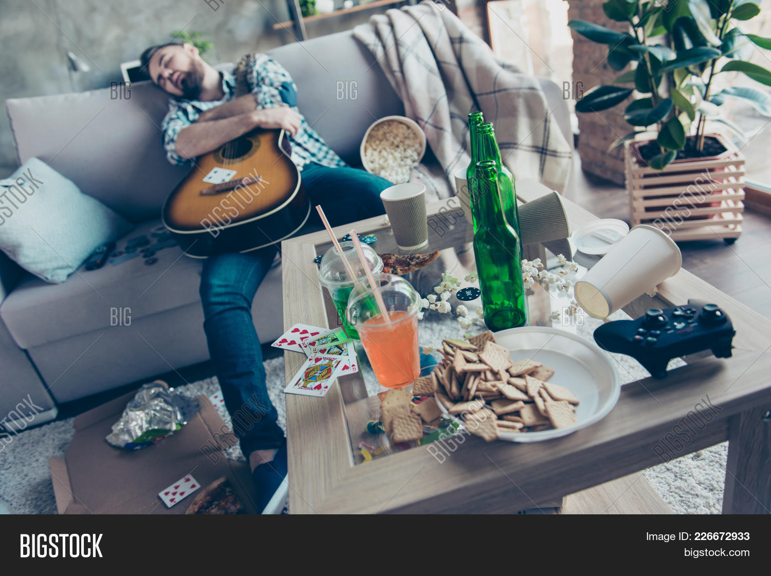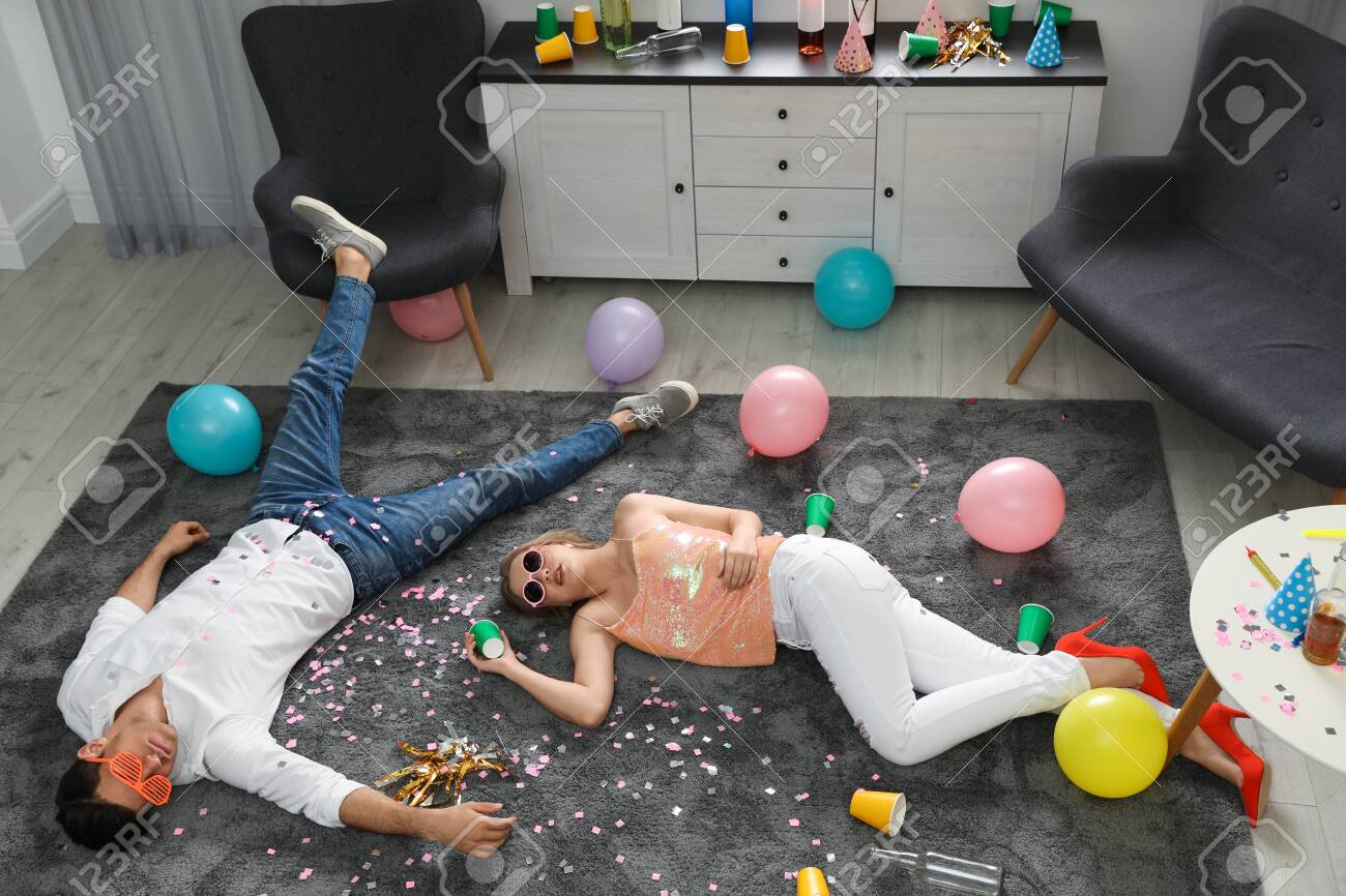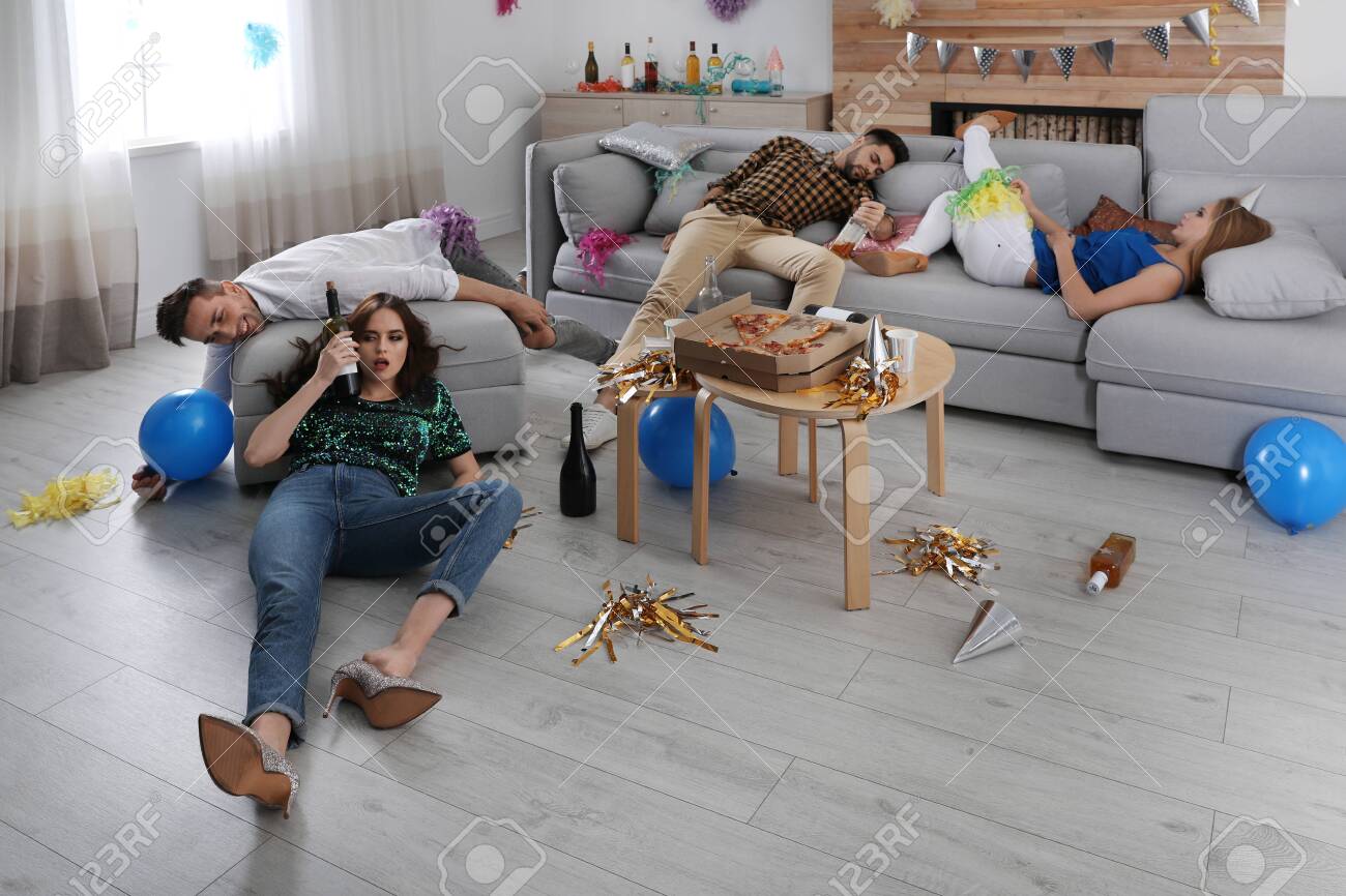 Drunk Friends Sleeping On Sofa In Messy Room After Party . . .
