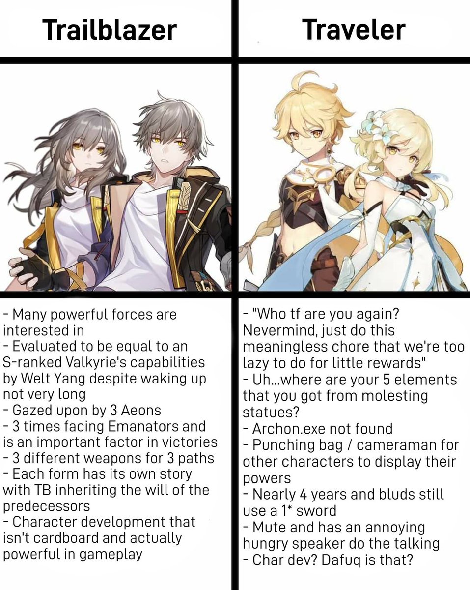 Sebenernya ini bukan ide baru, mungkin dalam pembuatan dan penulisan character traveller, mihoyo pakai mesin waktu dan mencuri ide potential man untuk diaplikasikan kepada traveller, berbeda dengan childe yang potentsialnya secara lore dan digameplay sama-sama busuk, traveller adalah versi yang lebih baik dimana di lore dia sebenernya cukup ngeri (setara king von?) Dan sejujurnya traveller ini masih jauh lebih baik ketimbang para archon, at least masalah-masalah di region mereka bisa diselesaikan dengan bantuan traveller.