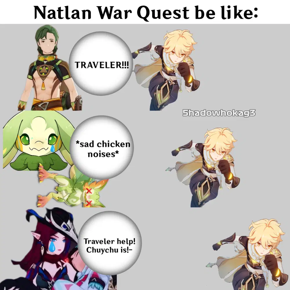 Sejujurnya ini lebih kearah lazy writing aja dari mihoyo, mereka gabisa ngasih cara yang make sense untuk player mau ngambil side quest, makanya semua NPC di teyvat dibikin brain dead semua, berisihin gereja? Panggil traveller, nganter makanan? Panggil traveller, terjang badai petir yang di lore udah bunuh ratusan orang demi dapet 1 resep makanan yang efeknya biasa aja? Panggil traveller (ini quest beneran btw Gourmet Supremos di Inazuma)