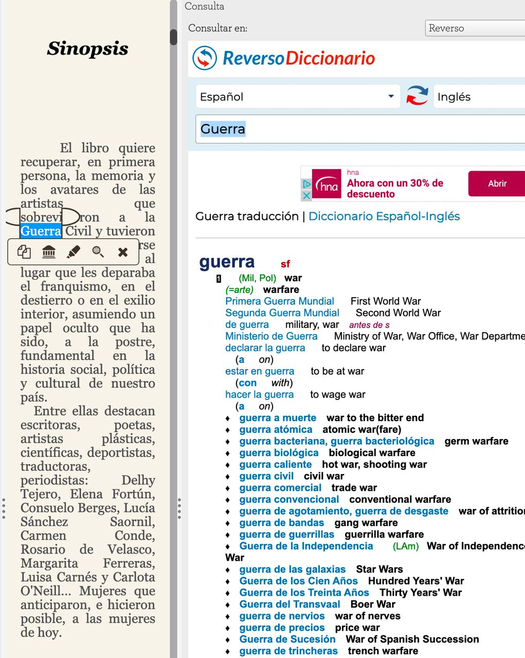 Y si pinchas en el 2º icono de la izq. te lleva a Google traductor directamente o puedes elegir otras fuentes.