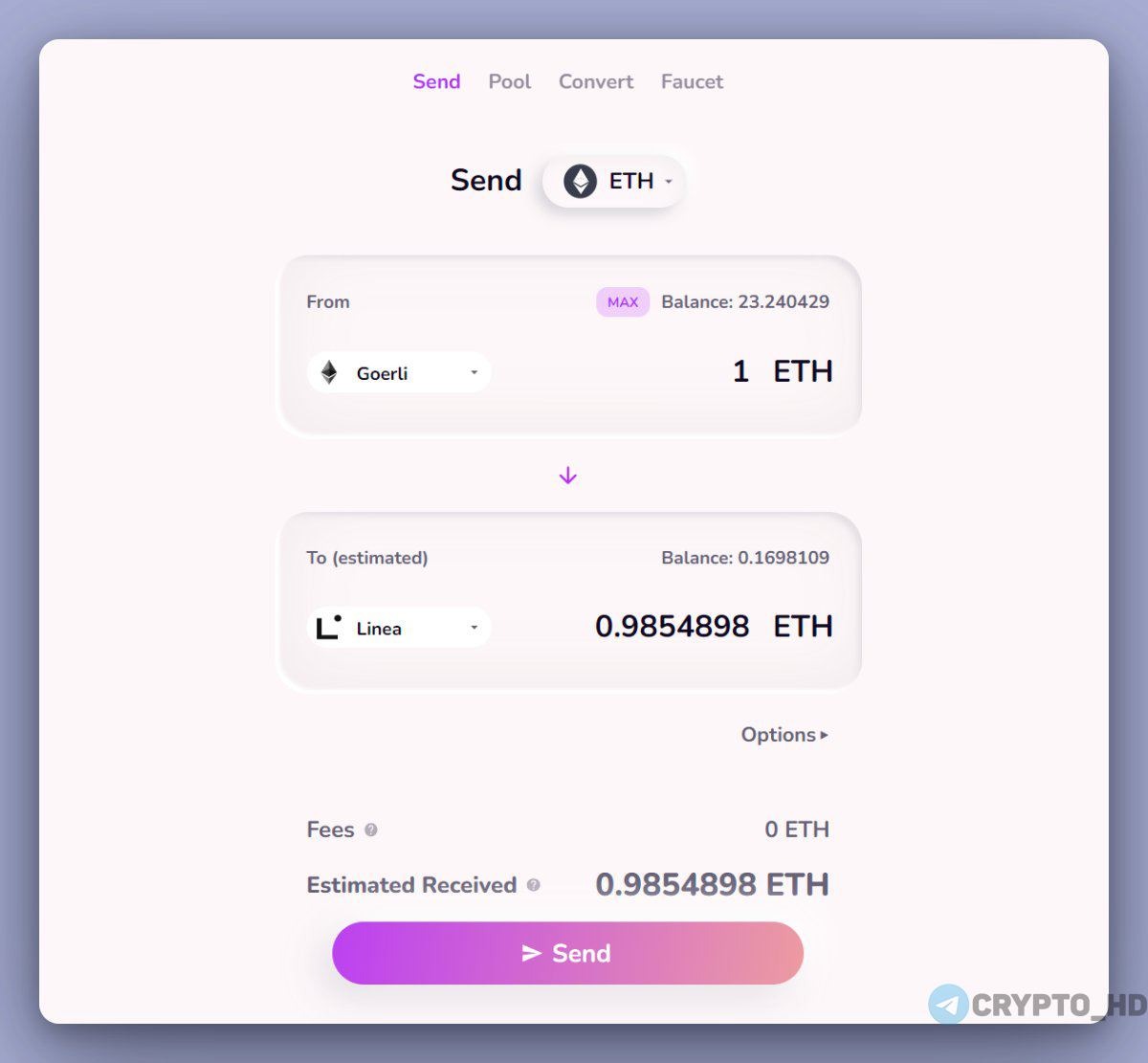 3. Обменяйте GoerliETH на LineaETH по ссылке: https://goerli.hop.exchange/#/send?token=ETH