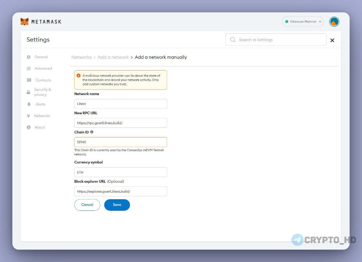 1. Добавьте сеть Linea в свой кошелек Metamask: