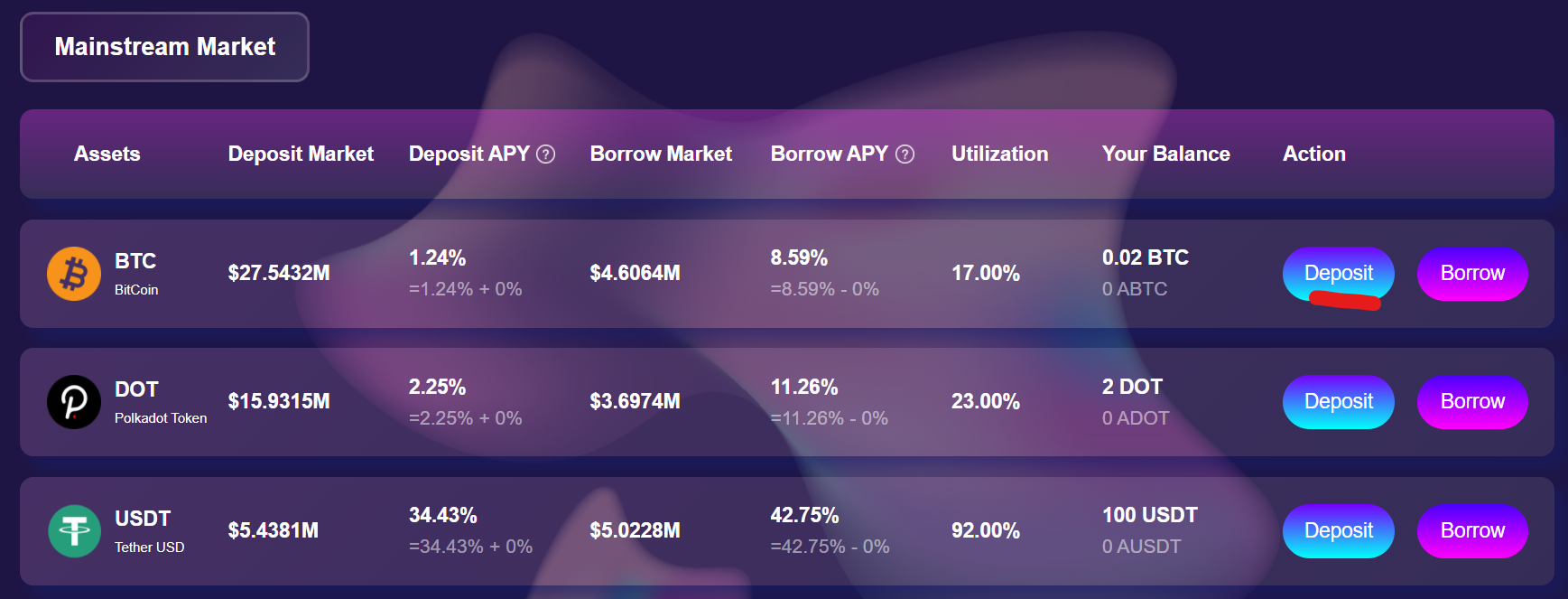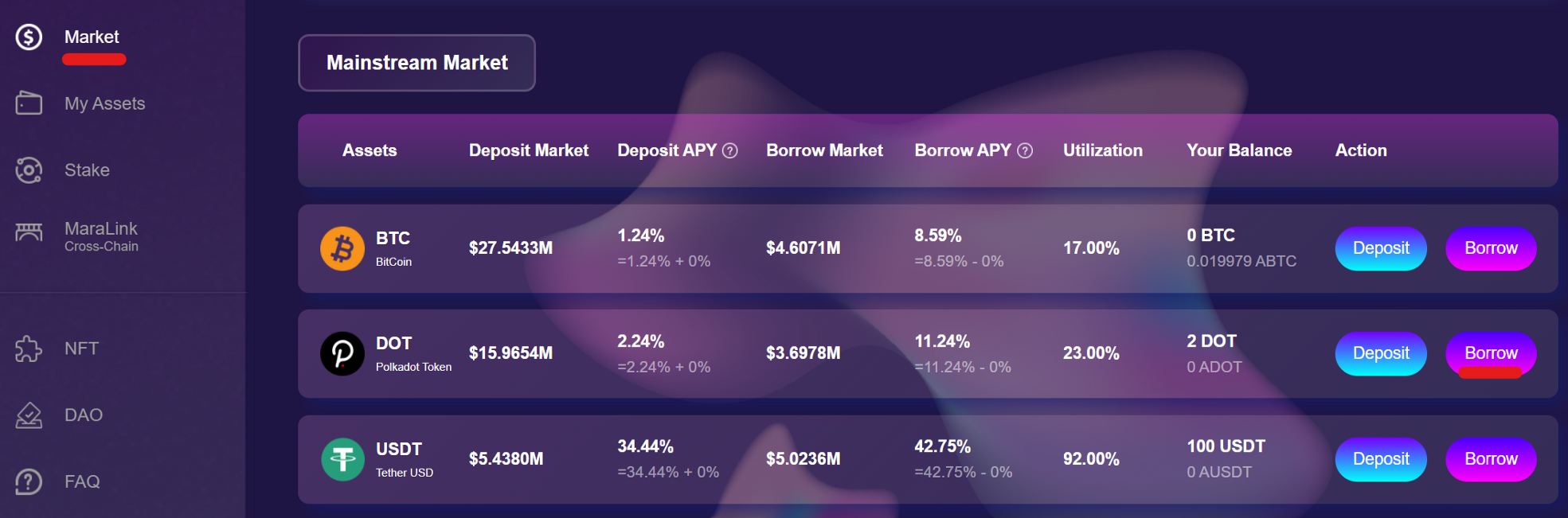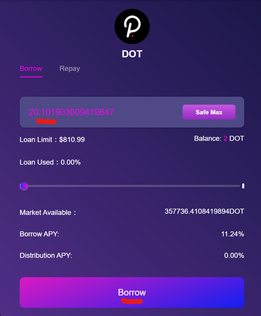We then head back to “Market” and borrow some $DOT.