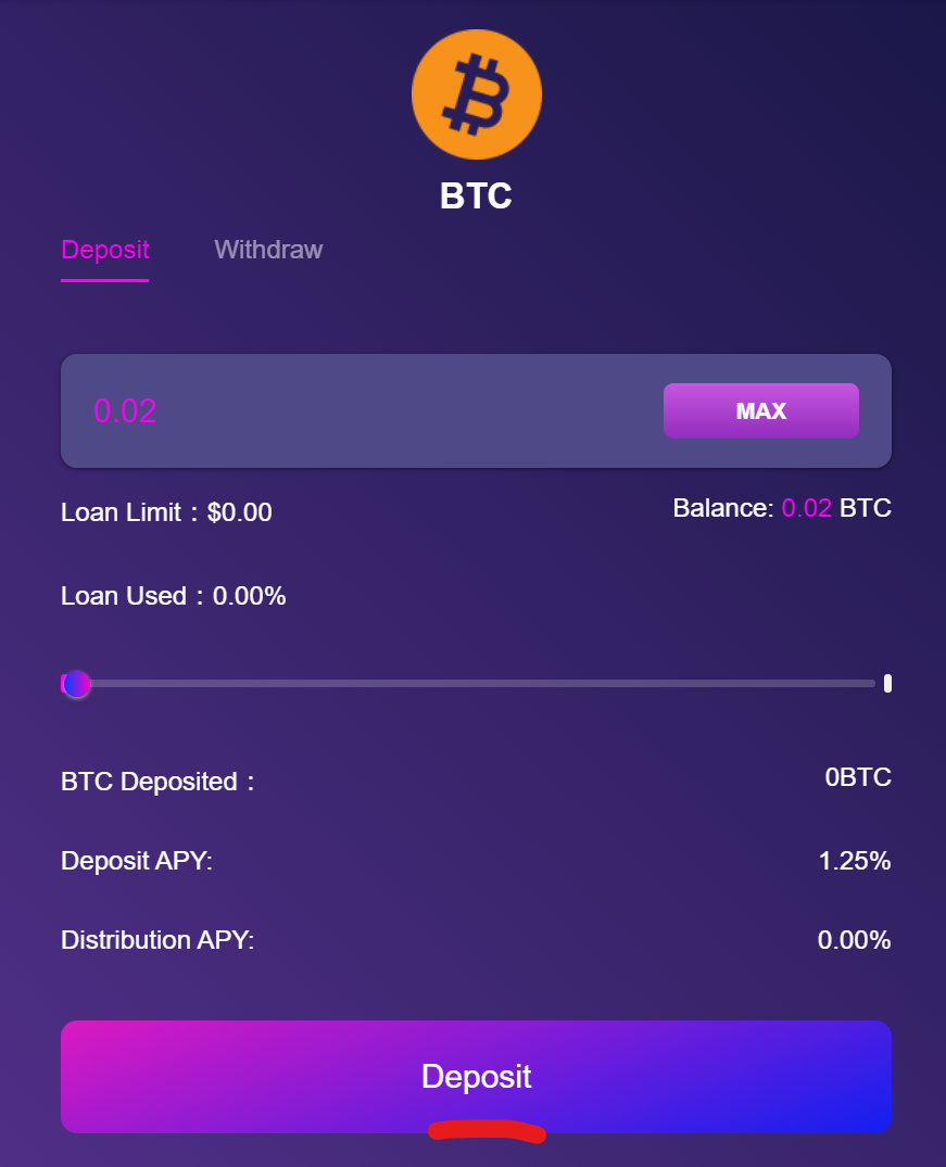We first deposit some $BTC.