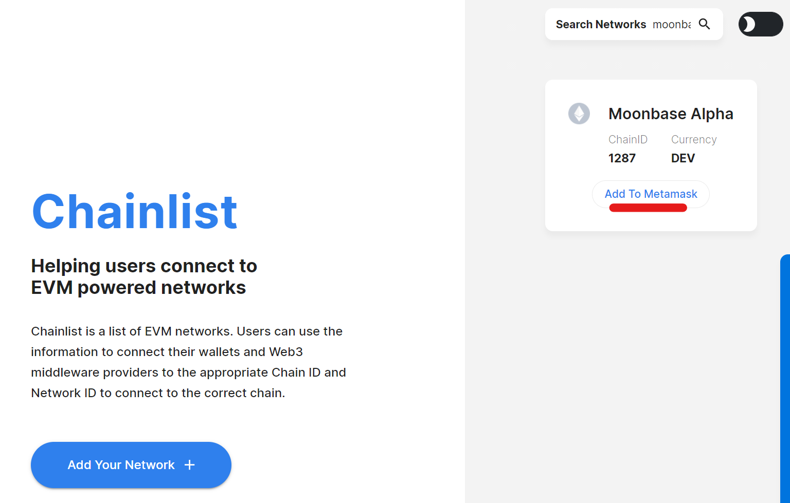 Head to https://chainlist.org/ and search for Moonbase Alpha. Add this network to your Metamask.