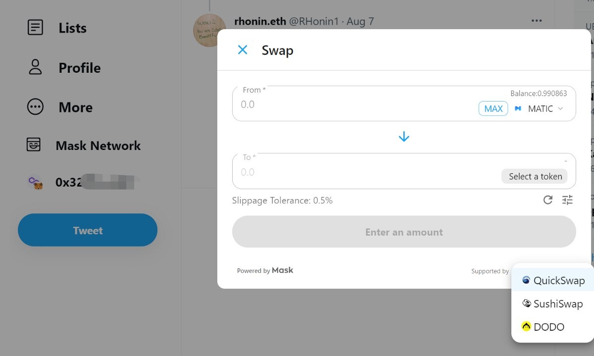 • Head to https://mask.io/ and install the Mask Network extension for your browser. Link it with your Twitter..
