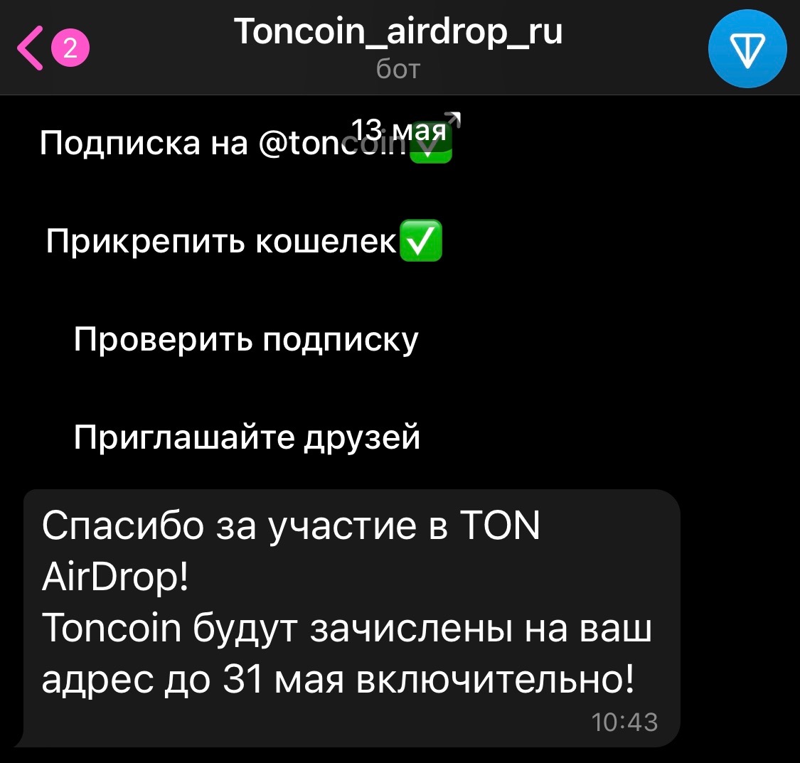 Вот пример айрдропа от TonCoin (который мне так никто и не начислил…)👇🏻