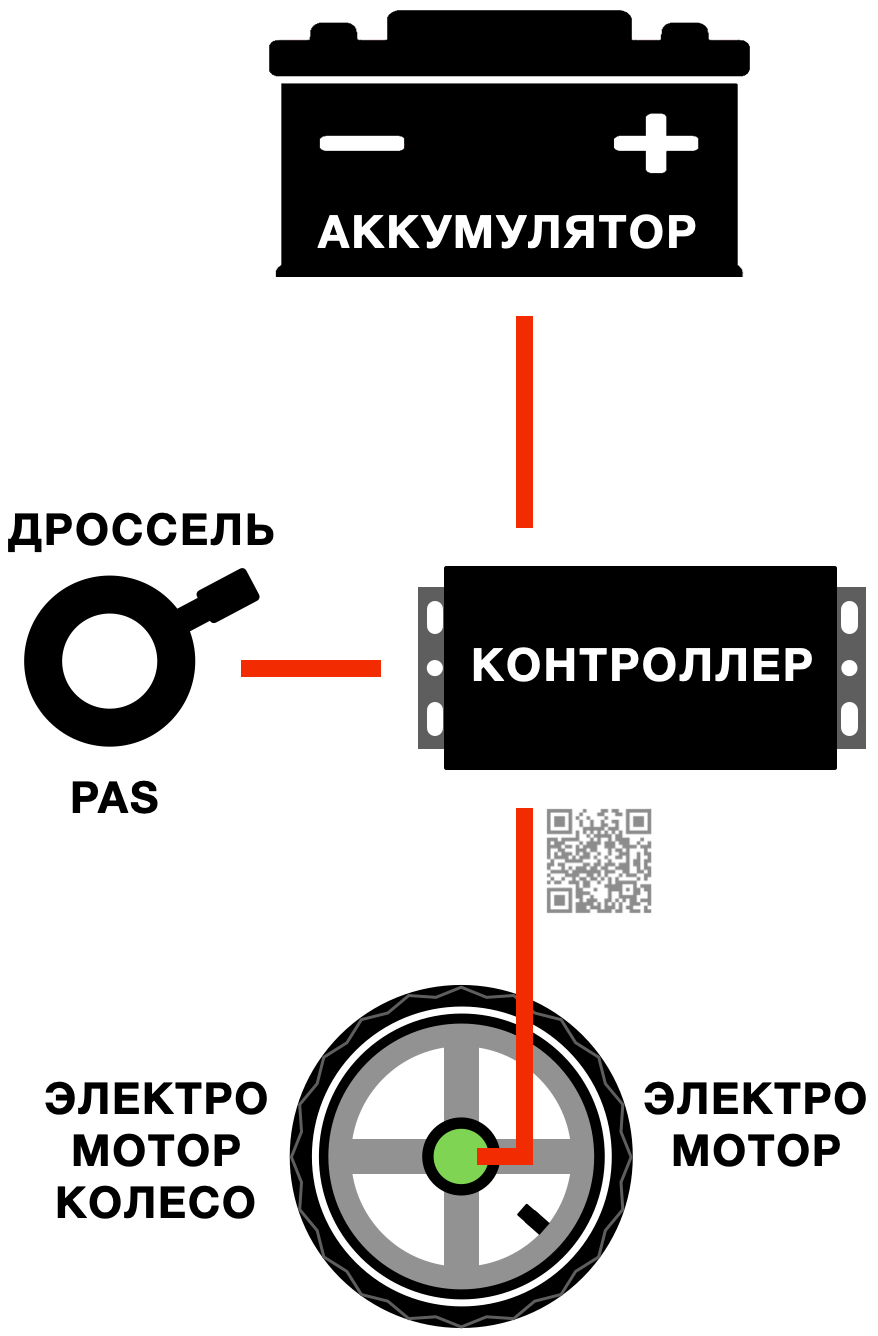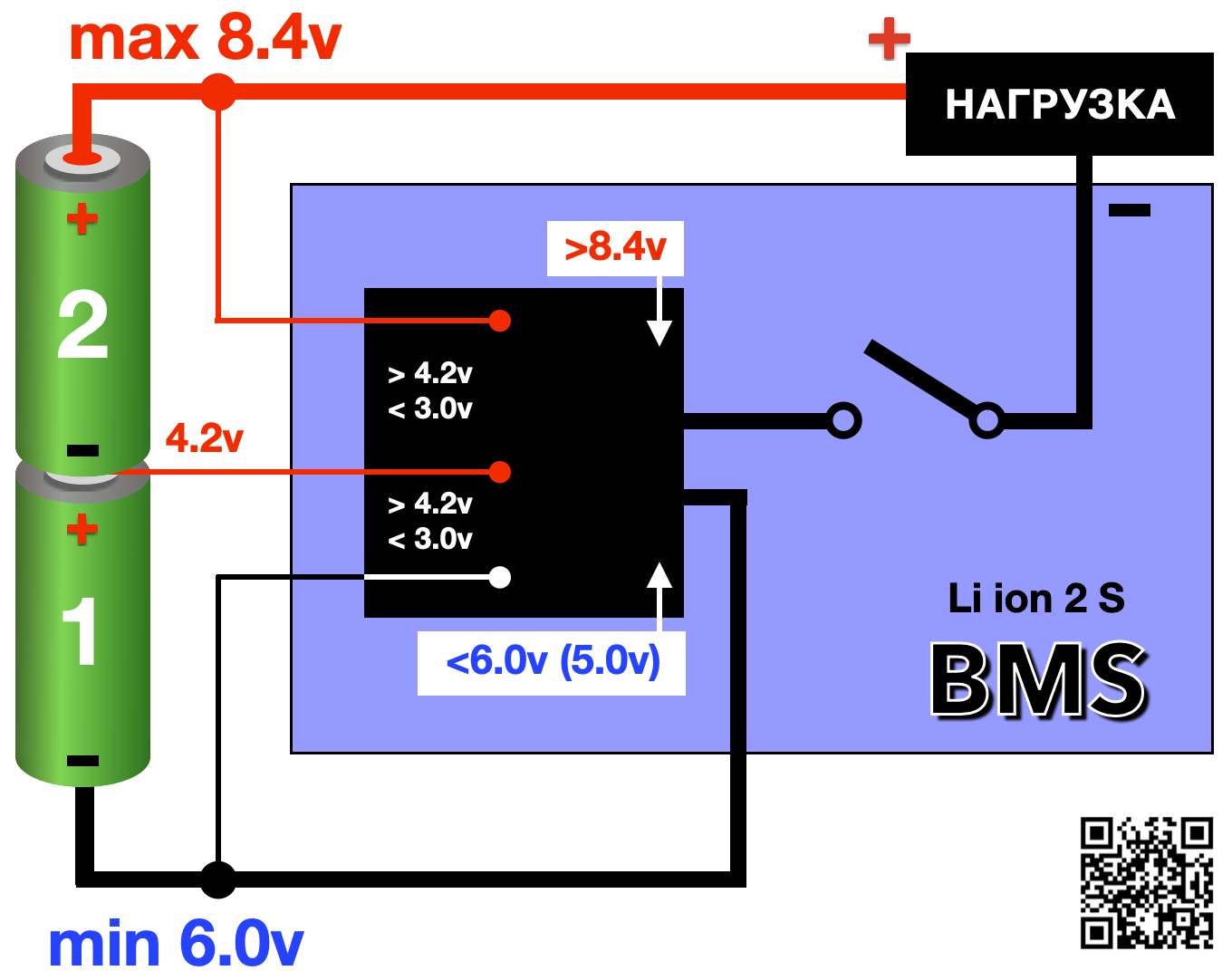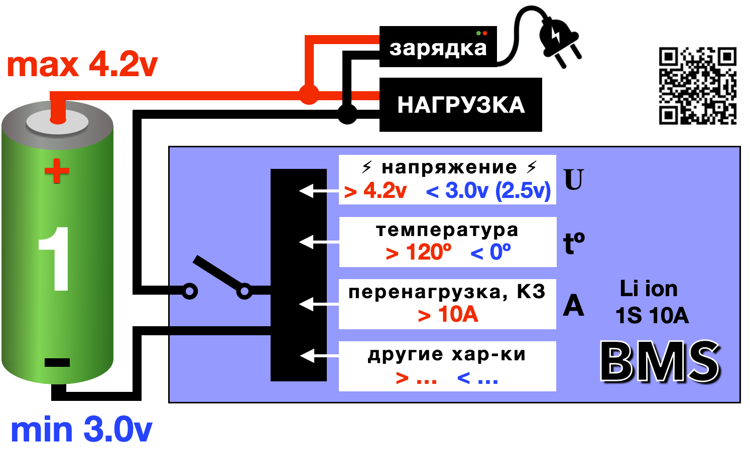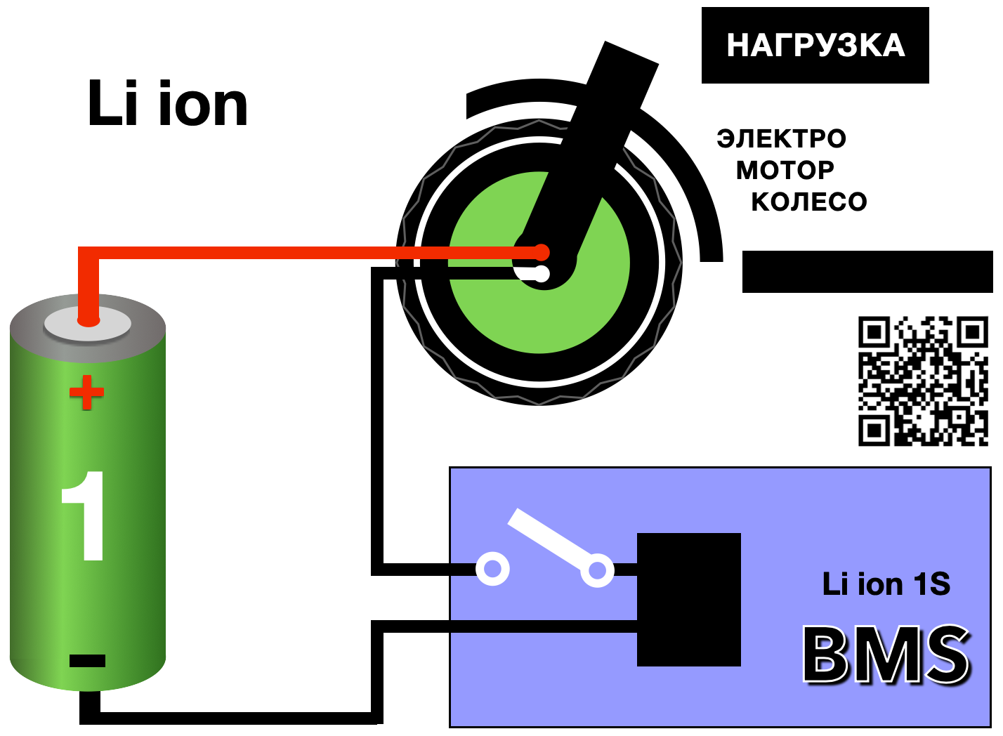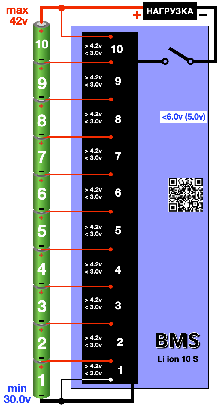 BMS (Battery Management System) – электронная плата, подключенная между аккумуляторной батареей и нагрузкой (электромотор, свет и т.д.), которая контролирует необходимые параметры напряжения, нагрузки и температуры, как в целом АКБ, так и по отдельности, каждую секцию в сборке АКБ. При выходе одного из параметра за предел допустимого, BMS отключает заряд или разряд АКБ.