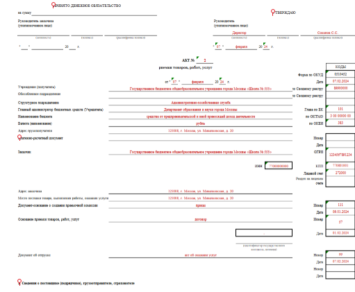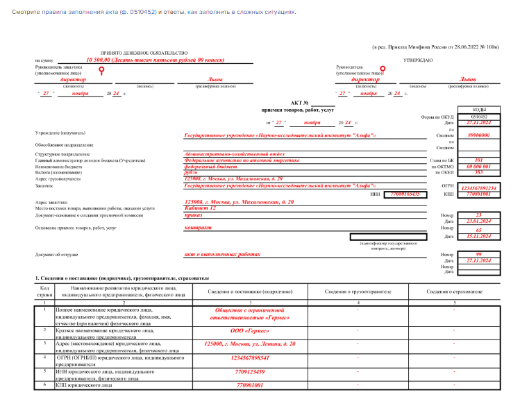 Акт 0510452 как заполнить