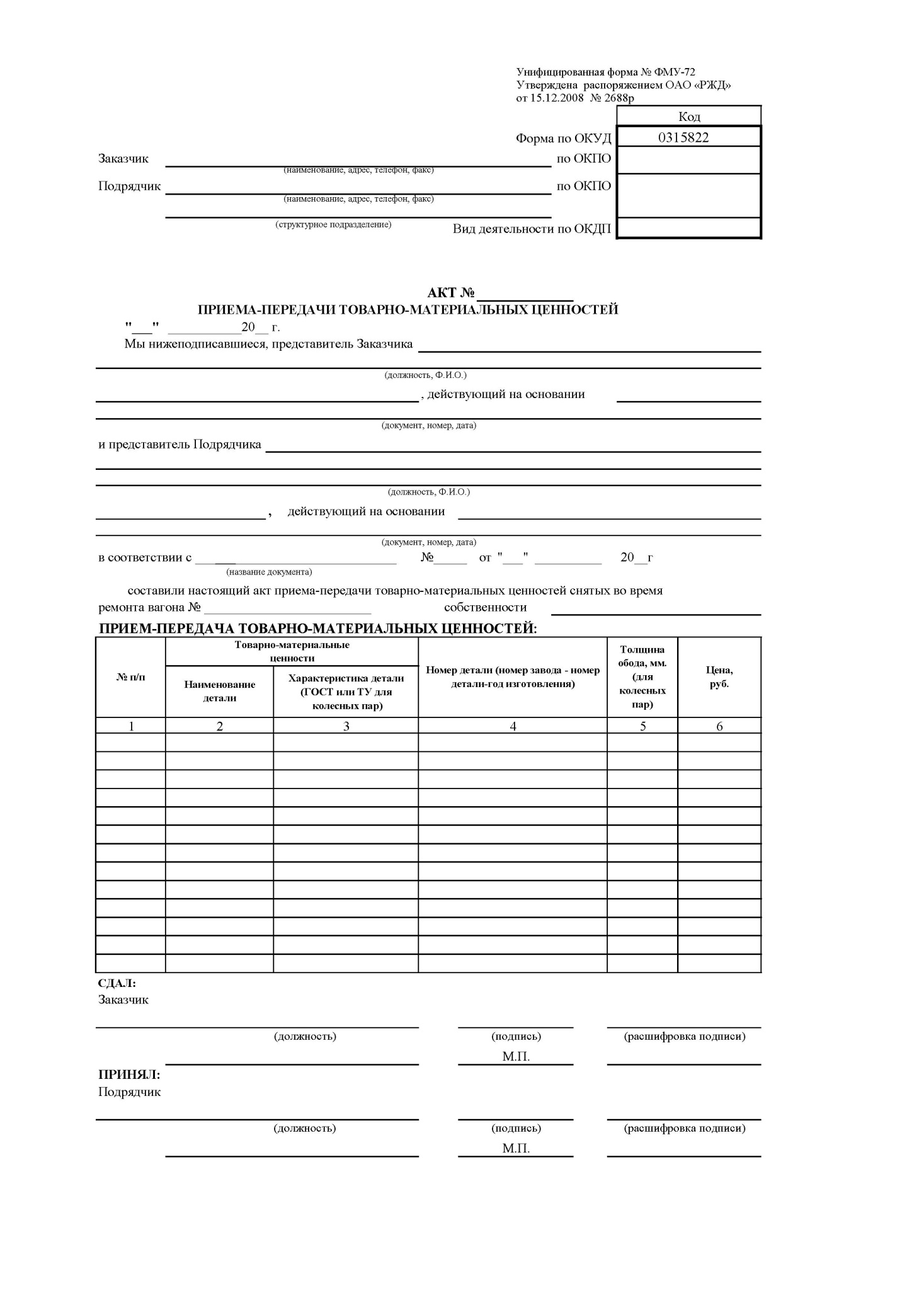 Акт передачи тмц бланк