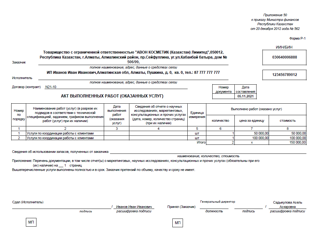 Акт выполненных работ рк образец