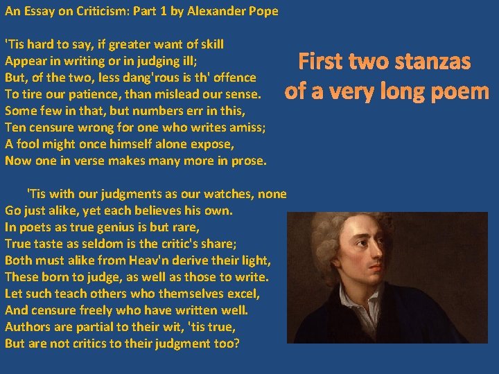 An Essay On Criticism Poem by Alexander Pope . Read Alexander Pope poem:Part I INTRODUCTION . That it is as great a fault to judge ill as to write ill, and a more dangerous one to the public . That a true Taste is as rare to be found as a tru .