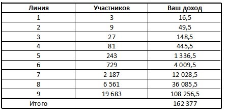 Таким образом у вас в первой линии 3 участника, во второй 9 и так далее.