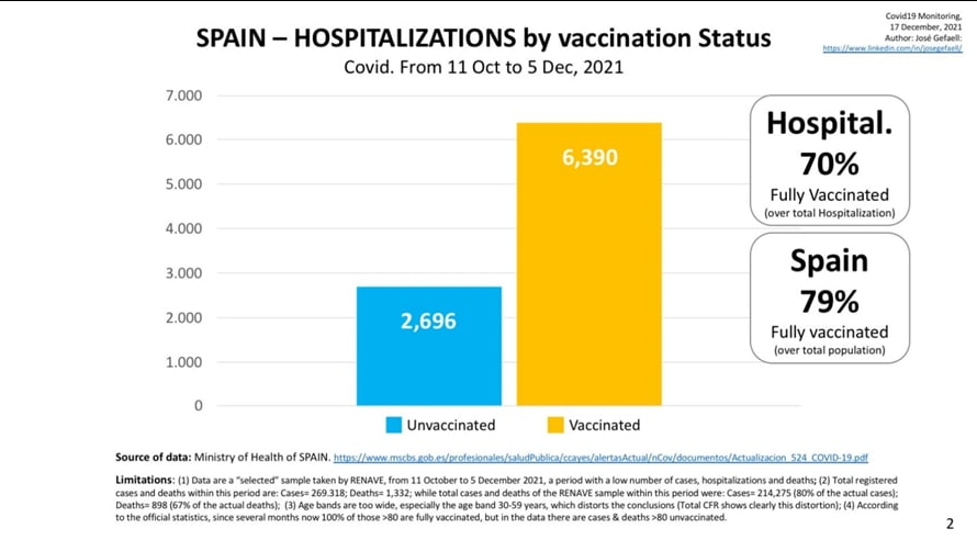 A pesar de la información distorsionada de los grandes medios, en el Estado español se repite este mismo patrón. Desde que los datos contradicen a la versión oficial (finales de noviembre) el Ministerio dejó de publicar los datos desagregados de mortalidad-covid de vacunadxs/novacunadxs, publicando solamente información de "casos" (PCRs positivas). Un dato sesgado, ya que todas las personas novacunadas son sometidas a la PCR ante un ingreso hospitalario, sea cual sea la causa o los síntomas. Aún así, según los datos del ministerio los casos-covid en personas con vacunación completa son el 79,26% a fecha de 23 de diciembre´21 (con un 89,8% de la población objetivo con la pauta completa).