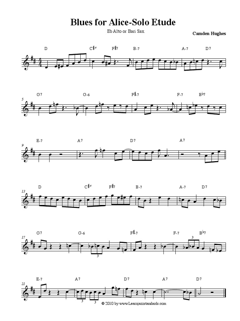 Blues for Alice on Learn Jazz Standards is a great way to improve your ability to play more inside the changes with bebop ideas . Check out our Blues for Alice jazz etude and the solo transcription of Charlie Parker's solo below! Blues for Alice isn't just an easy blues with I, IV, and V chords .