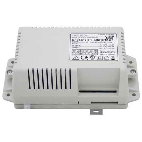 Unité de puissance. Conçu pour alimenter les interphones VIZIT avec une serrure. Relais de contrôle de verrouillage intégré. Caractéristiques de l'alimentation BPD18/12-3-1 : tension d'entrée 190-240VAC ; sortie : 18 V/0,6 A, 12 V/0,6 A – non stabilisé, 12 V/0,1 A – boîtier en plastique ;Bloc d'alimentation pour interphone BPD18/12-3-1 bloc d'alimentation à trois canaux BPD18/12-3-1 avec alimentation séparée pour serrure, caméra de télévision, interphone/vidéophone VIZIT tension alternative, V (50-60 ; Hz) ~220+22-33 ; puissance, VA, pas plus de 30 ; tension de sortie 18 V/0,6 A non stabilisée ; tension de sortie 12 V/0,1 A stabilisée ; plage de température de fonctionnement de +1 °C ; à + 40°C ; dimensions hors tout, mm 165x90x60 ; poids, kg, pas plus de 0,9.