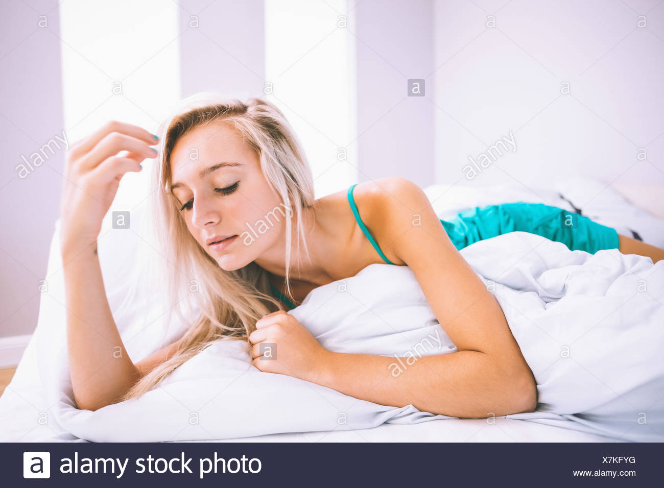 Zierliche junge Blondine liefert ihre perfekte kleine Muschi aus