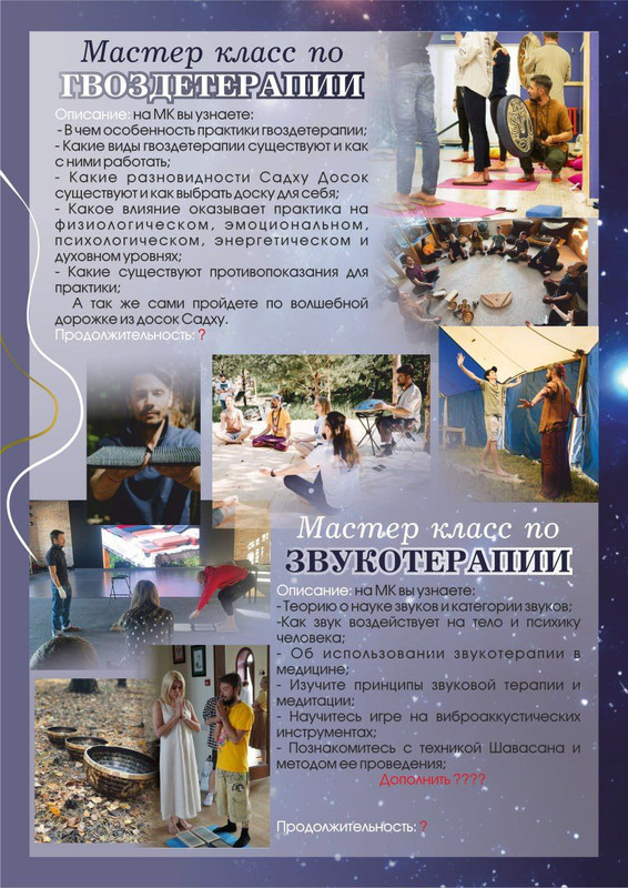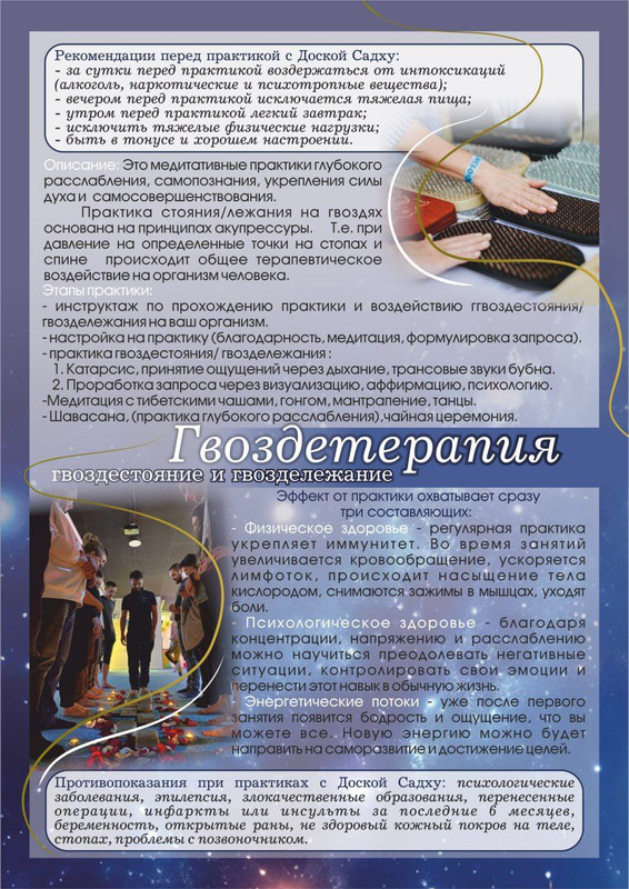 Провожу Индивидуальные(консультации)и групповые занятия по медитации, гвоздестоянию и гвоздетерапии звукотерапии с Гонгом Бубном Тибетские чаши караталы коши и перкуссия Лекции Мастер классы,обучение на проводника