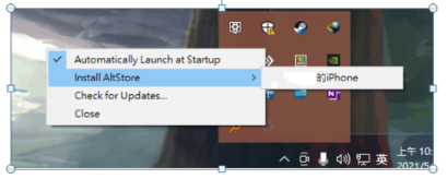 4. After opening the application, go to the bottom right corner and find the application icon from the “Show Hidden Icons” and right click “Install AltStore” → XXX’s iDevice. After selecting, you will required to enter your Apple ID and password. After confirming, the AltStore App will be installed in your device and show up on the homepage.