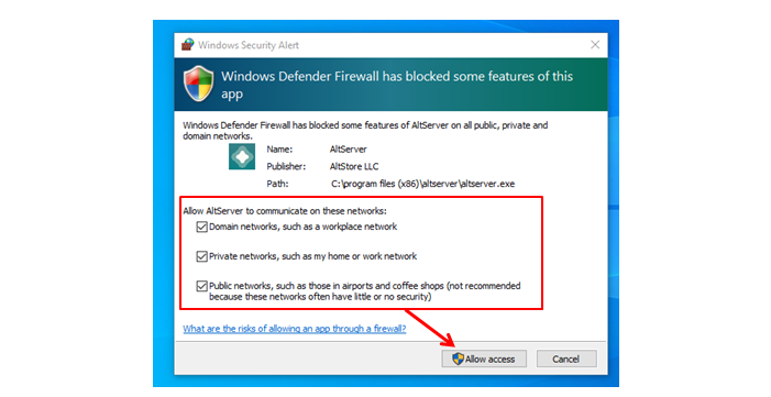 On first start up, a Windows Defender notification will pop up. Please select “Private networks” and “Public networks” and "Allow access.”
