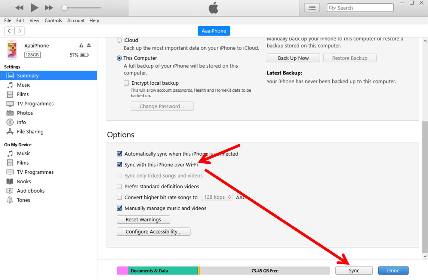 Connect your iDevice to a computer and open [iTunes] →「Summary」→「Sync with this iPhone over Wi-Fi」→「Sync」