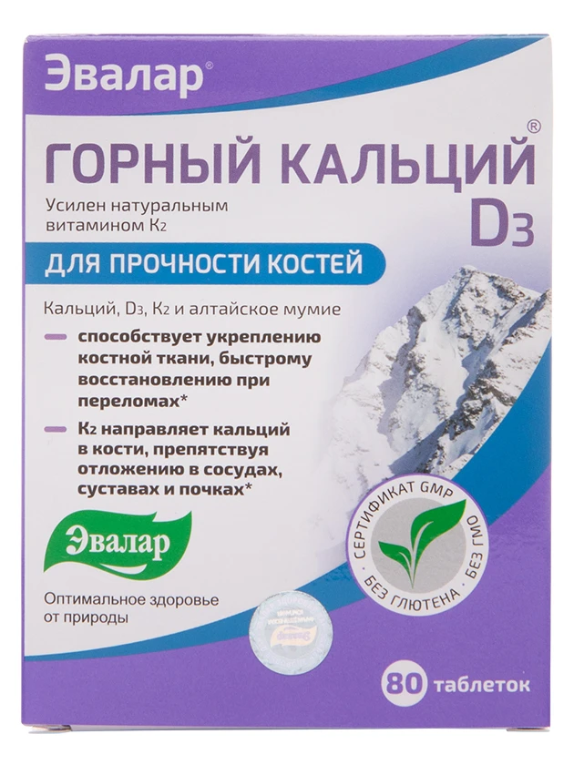 Горный кальций D3 с мумие- инструкция, цена 257 руб | купить на официальном сайте Эвалар | Отзывы и инструкция по применению . Горный кальций D3 с мумие . Сочетание кальция, витамина D3, К2 и алтайского мумие в 1 таблетке 100% восполняет дефицит кальция в организме .