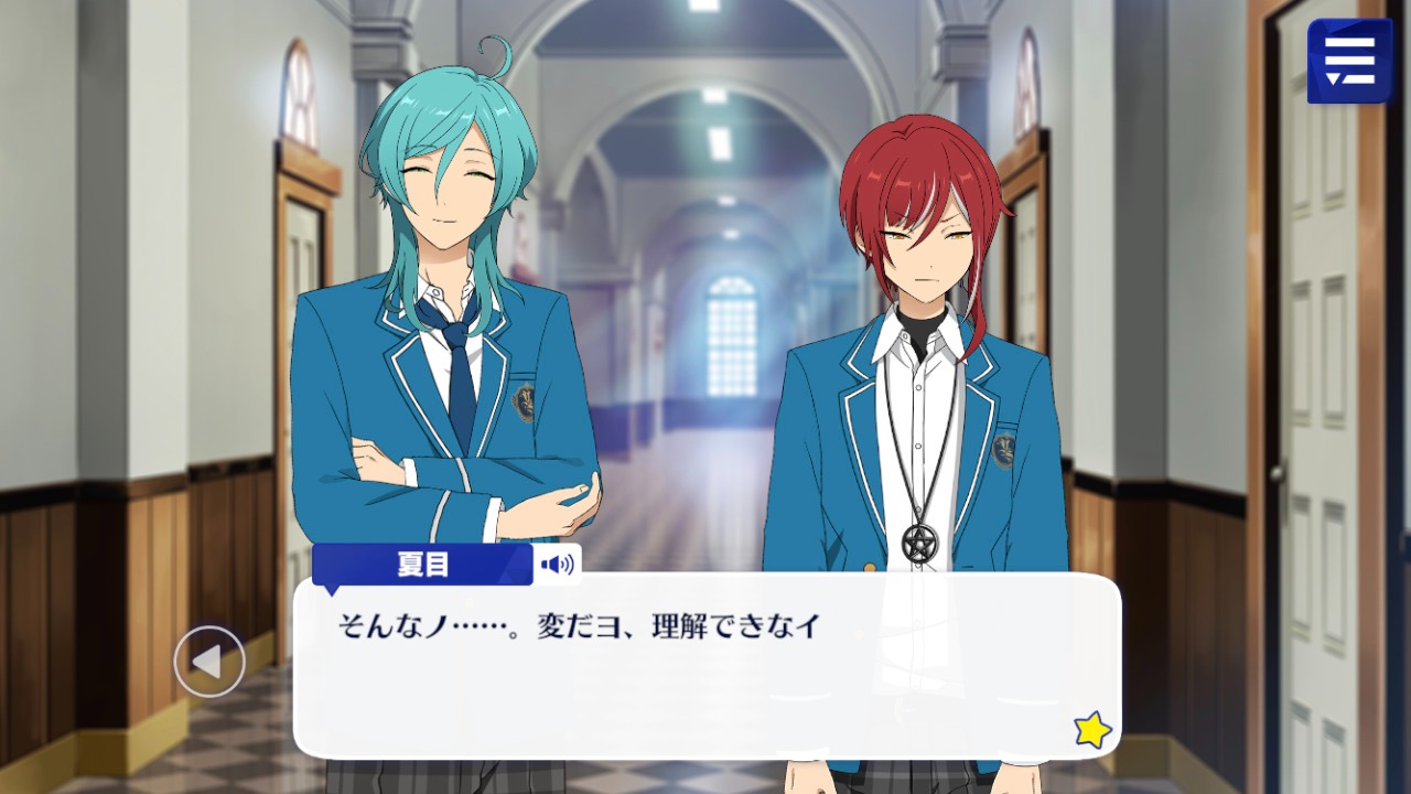 Нацуме: ЗнаЕШЬ, я всегда думаю о том, насколько уникально ты смотришь на мИР, братец Каната. Нас объединили в «Пятерку чудаков», но даже среди всех нАС, только ты исключительно такОЙ.