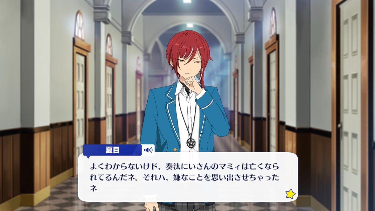 Нацуме: Возможно, я не до конца понимАЮ, но… Это означает, что мамочка братца Канаты умерЛА, дА? Кажется, неприятные воспоминания вернулИСЬ.