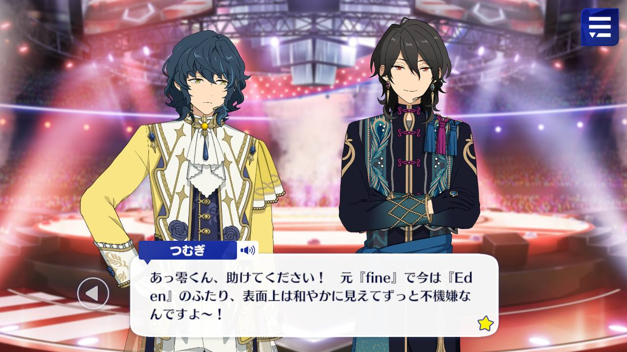 Цумуги: Рей-кун, пожалуйста, помоги мне! Эти двое из «Eden», которые изначально были в «fine», выглядят мирно, но они всегда в таком ужасном настроении~!