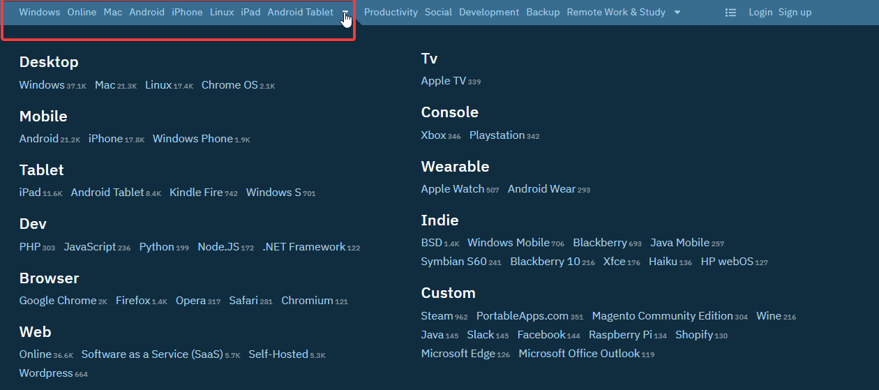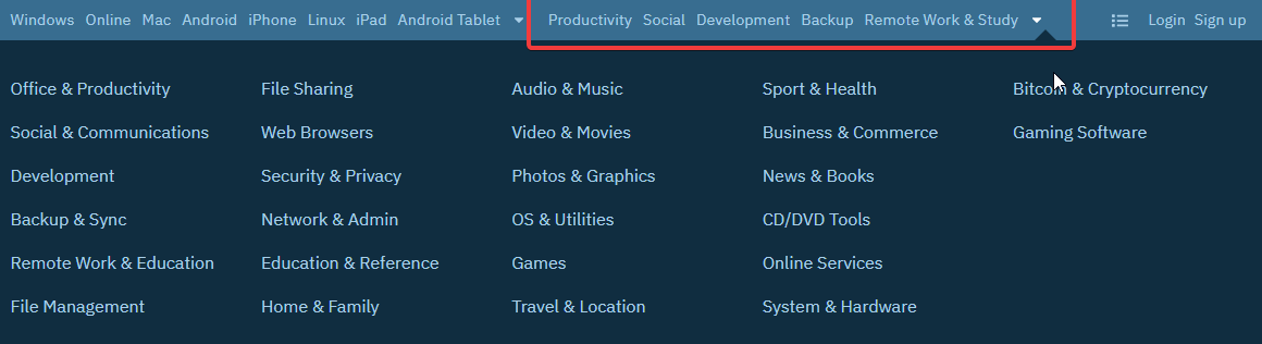 Добавлю, можно искать не только по названию ПО, а так же по платформе или по разделам, нужно лишь выбрать из шапки интересующий нас вариант: