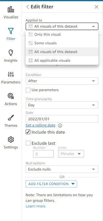 можно применять фильтр на объект (график/таблица) ; на несколько объектов ; на все объекты в этом датасете ; целиком на всё