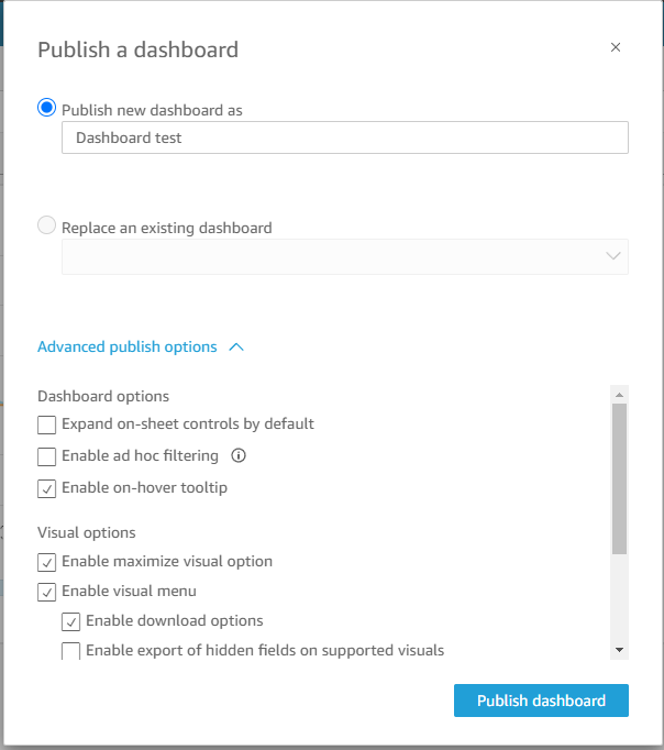 Из "анализа" можно публиковать дашборды, вот такие настройки при этом: