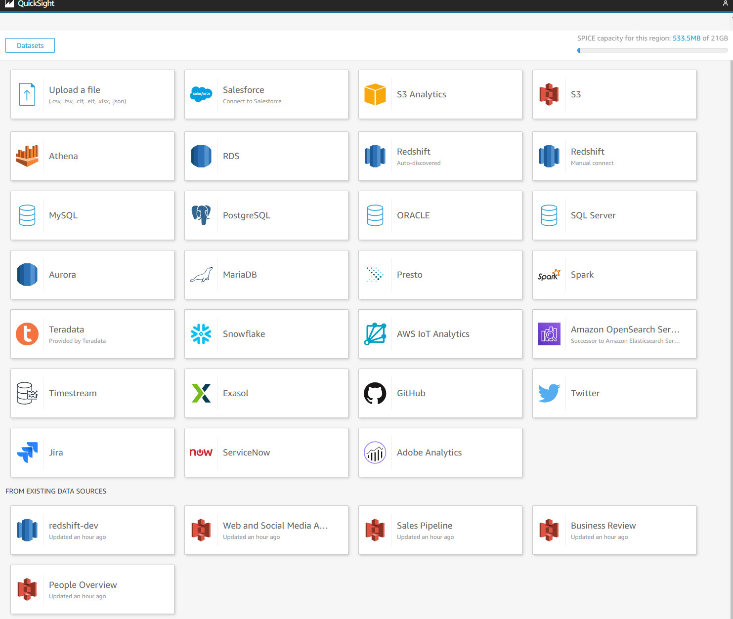 Датасеты можно загружать в "SPICE", но не обязательно, как я понял это что-то вроде внутреннего пространства QuickSight, и оно платно