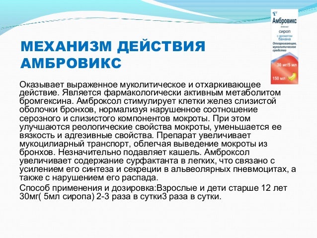 Механизм действия . Попадая в организм человека, амброксол поступает в кровь и быстро транспортируется в бронхо-легочную систему . В основном препарат воздействует на . железистые клетки слизистой оболочки бронхов и стимулирует выделения ими большого количества жидкого . . .