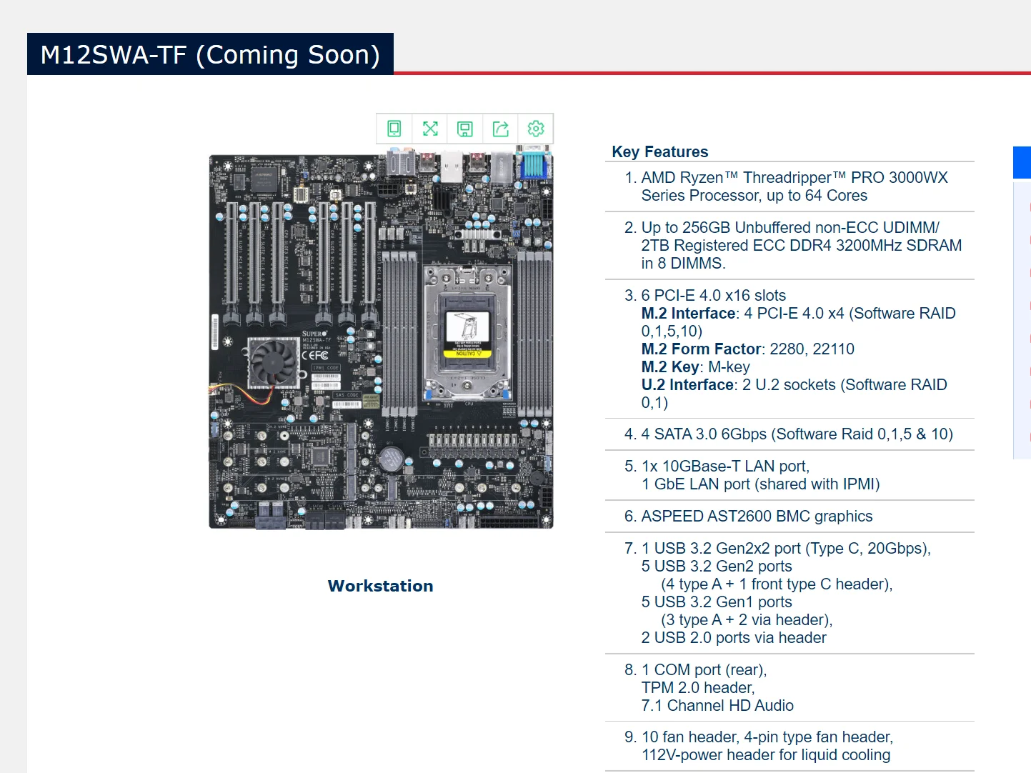 Она поддерживает все процессоры серии Ryzen Threadripper Pro 3000WX, вплоть до 64-ядерного Pro 3995WX . Плата содержит 8 слотов памяти с 8 каналами .