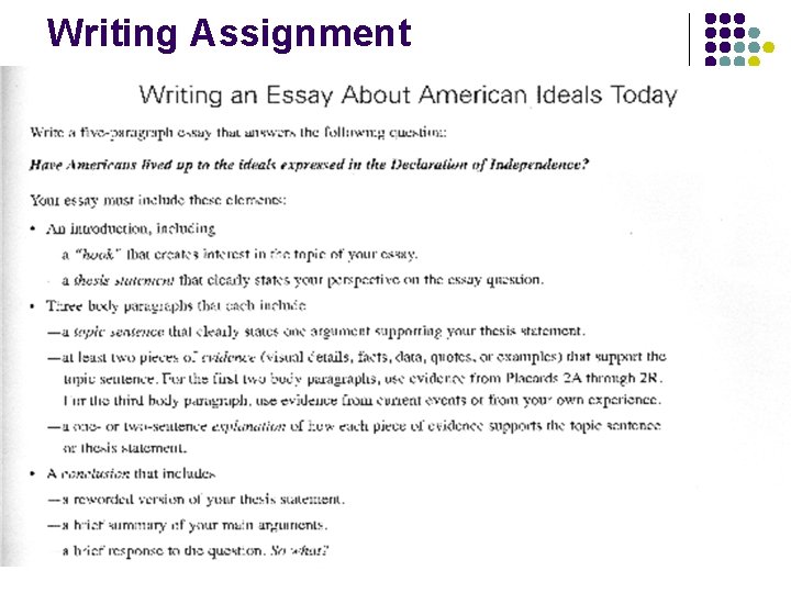 " American " Ideals Essay (30 points): due Friday, October 4th . Your assignment is to write a five-paragraph essay that deals with the relationship between the United States and its foundational years .