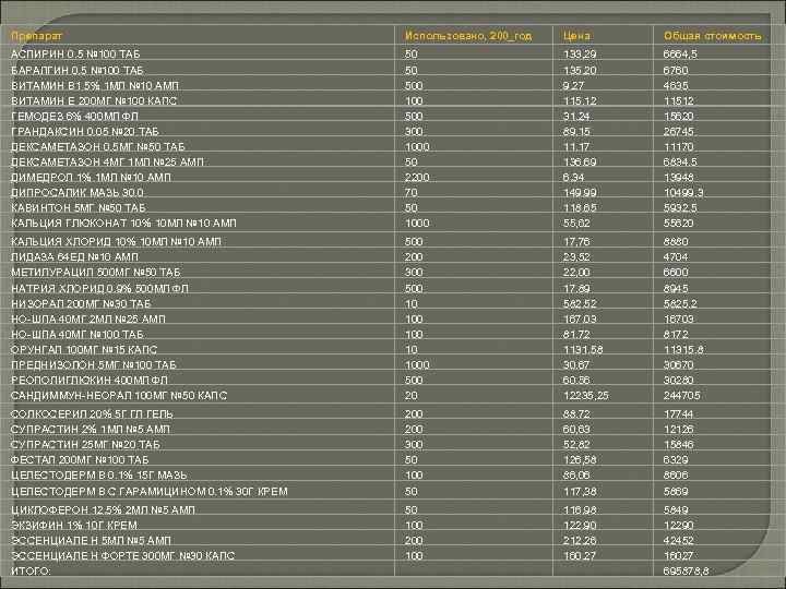 №п/ Торговое наименование медикаментов Амбулаторія Стаціонар 1 l-лизина эсцинат + + 2 l-цет - + 3 Абактал* - + 4 Аброл - + 5 Абиклав- +