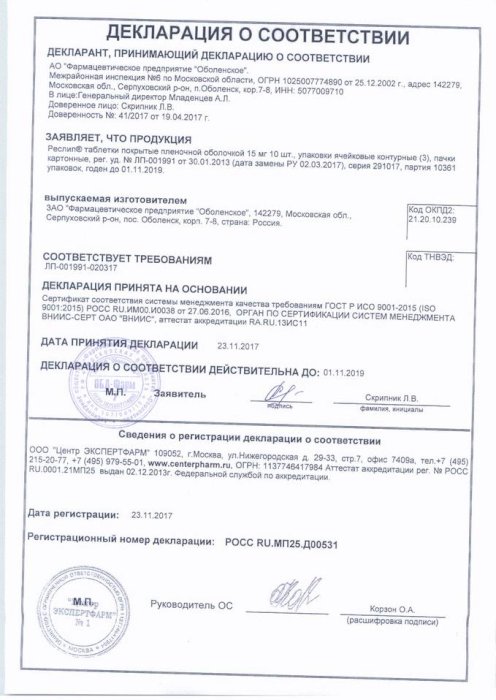 Дополнительными веществами в таблетках являются: целлюлоза микрокристаллическая, тальк, моногидрат лактозы, диоксид кремния, стеарат магния, крахмал прежелатинизированный.