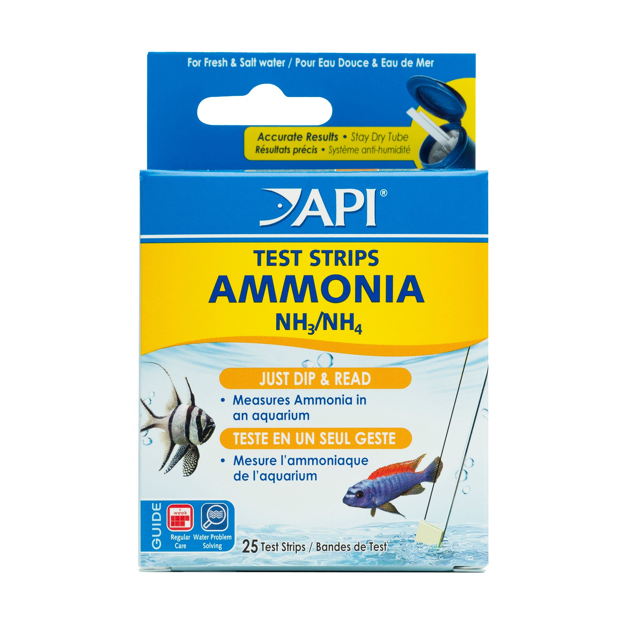 DESCRIPTION API Ammonia Test Strips made be used in both freshwater and saltwater aquariums to test for water problems that can be harmful to fish . Use these strips several times a week to make sure your aquarium water remains safe and healthy for its inhabitants .
