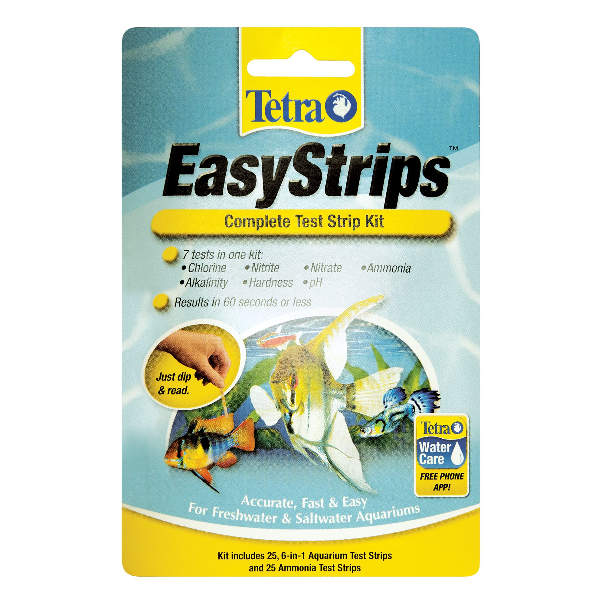 Tetra's Ammonia Strips test only for ammonia levels present in your aquarium . They too only require a dip in the aquarium water and will give you the quickest results! In just ten seconds, you will find out if your ammonia levels are safe in your aquarium . Ammonia Strips are also available in 25-strip count and 100-strip count packages .